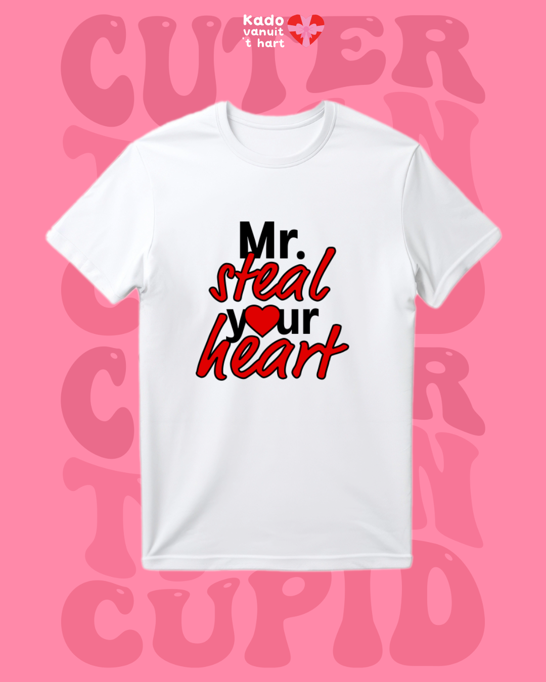 Dit schattige Valentijns shirt met de tekst ''Mr. steal your heart'' is perfect voor kleine charmeurs. Met zijn speelse letters en hartdetail straalt het shirt liefde en vrolijkheid uit. Het shirt zit comfortabel en is makelijk te combineren met elke outfit. Een echte eyecatcher voor een dag vol liefde!